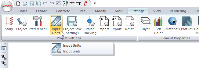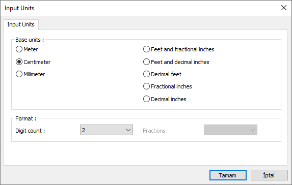 The unit to be used during data entry in the ideCAD is determined by clicking Input Units settings. The unit chosen in this dialogue is effective in all dialogs, coordinates and dimensions.