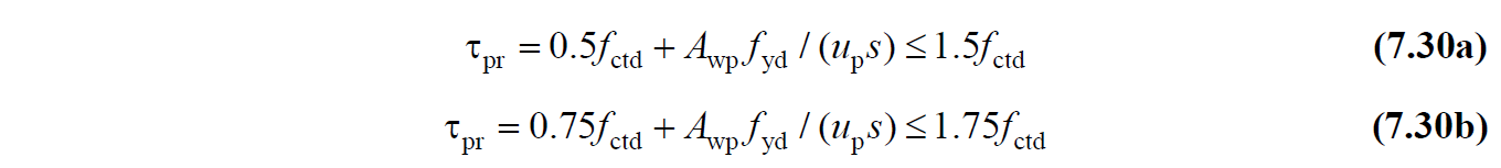 TBDY Article 7.11.12 - In cases where closed stirrup strips or sliding wedge rails are used in at least two perpendicular directions, instead of placing the punching reinforcement in a uniformly distributed manner , the punching strength of the reinforced plate in terms of shear stress Equation (7.30a) ; If sliding wedges are used, it will be calculated with Equation (7.30b) .