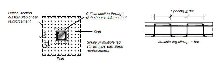 The shear reinforcement engages longitudinal reinforcement at both the top and bottom of the slab, as shown for typical details in ACI Fig. R8.7.6(a) to (c). The shear reinforcement should be symmetrical