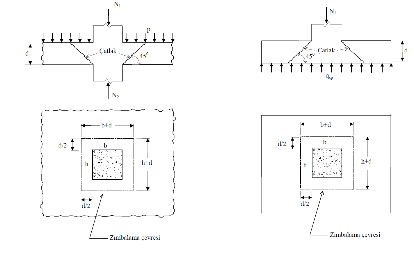 In non-beam slab systems where floors are directly supported by columns and in areas where raft foundations are connected to columns, principal tensile stresses occur around the column. When these principal tensile stresses around the column exceed the tensile strength of the concrete, it is natural that cracks occur perpendicular to the principal tensile stresses. Since the principal tensile stresses generally make an angle of 45 o to the plane of the plate , cracks will also occur at an angle of 45 o . With the formation of cracks, the strength of the concrete carrying the shear force is greatly reduced, so it punches the column, slab or raft foundation slab. Punching control according to TBDY is done with the following steps.
