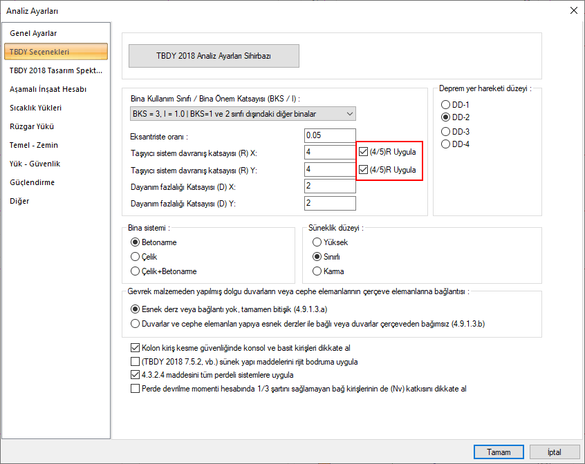 This message is given if the "Apply (4/5) R" option on the Analysis Settings / TBDY Options Tab is selected while the conditions (a) and (b) above are met.