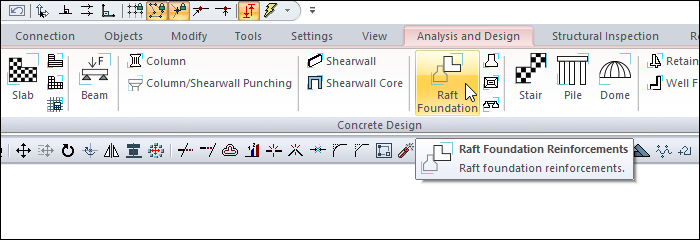 After analysis, you can access it by clicking on the Raft Foundation command under the Concrete Design title of the ribbon menu Analysis and Design tab .