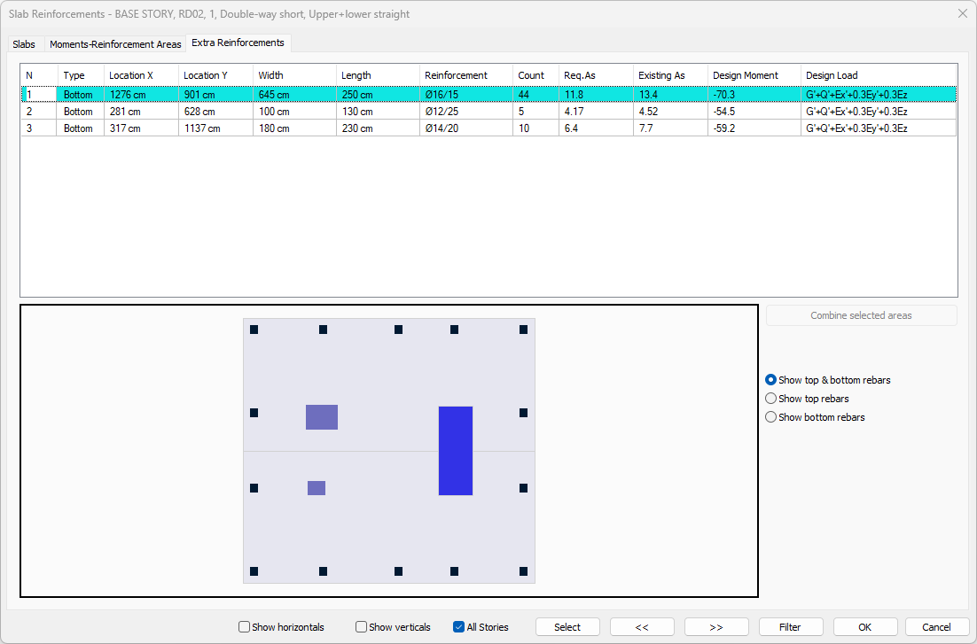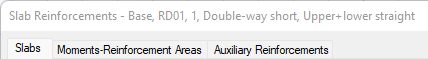 In the tab, detailed information about the additional rebar is given in the table, and in the schematic plan view, the information about the area of the additional rebar is given. Blue areas represent upper additional rebar zones, red areas represent lower additional rebar zones.