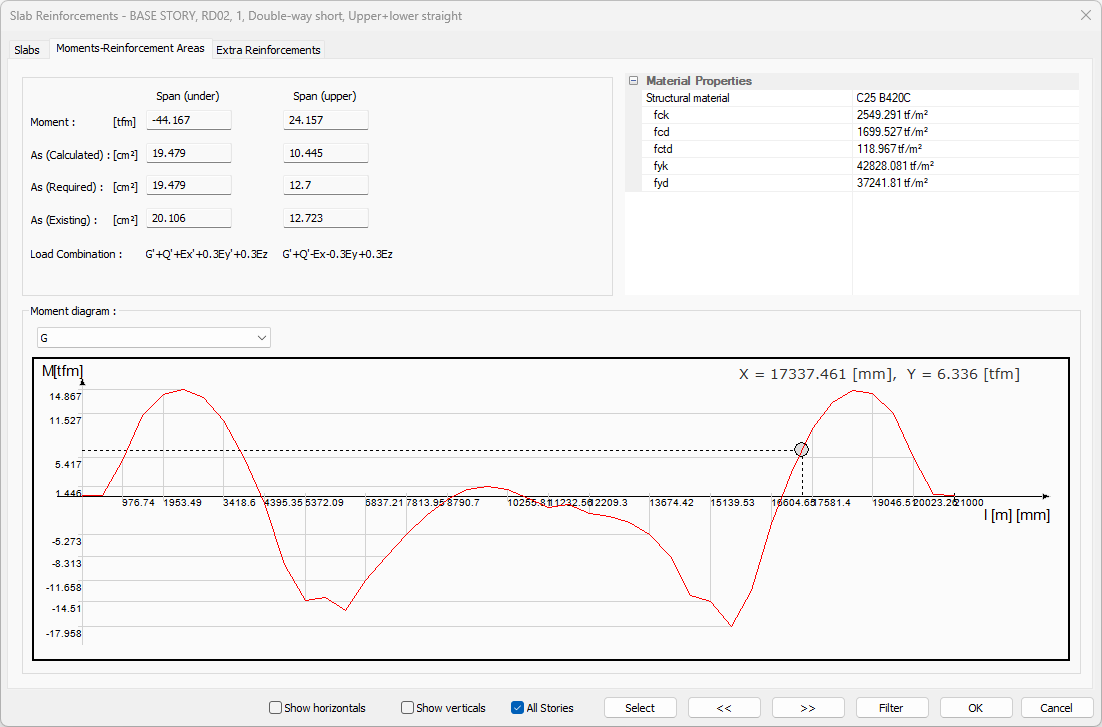 When flat rebar design is made on top and bottom for beams and non-beam slabs, the additional diameter and number are specified to cover the entire slab system. If the rebar calculation axis is selected as top and bottom straight, the program automatically creates additional zones on the supports required as a result of the plate analysis. After analysis and concrete design, the diameter and number of additional rebars are determined and listed on this tab.