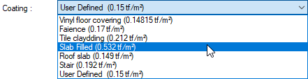 Coating ![]() The appropriate value for the coating load is selected from the list. The values listed in the list are the values defined in the slab load library and are prepared only for the foundation weight. The reinforced concrete weight of the raft foundation will be added automatically during the analysis. If you want to use another value instead of using one value in the list, select "user-defined" from the list and enter a value. |