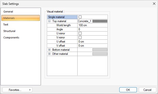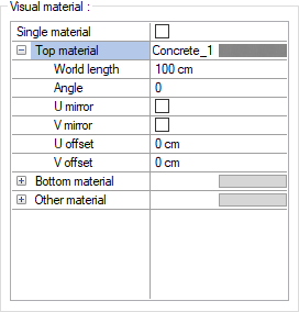 Visual material ![]() The material to be used on the top, bottom and other surfaces of the raft foundation is selected from the list. Surfaces are covered with the selected material and displayed as such in renderings. Texture length is entered into the world length. For example; If 1 is entered, the selected material texture is taken as 1 meter and covered on the relevant walls. In the angle, the angle of the texture is entered. Touch the U and V offset. The motion value in the x and y plane is entered. With U and V mirroring, the texture is symmetrical with respect to the y and x planes. By selecting the single material option, the material selected in "Top material" is used on all surfaces of the slab foundation. |