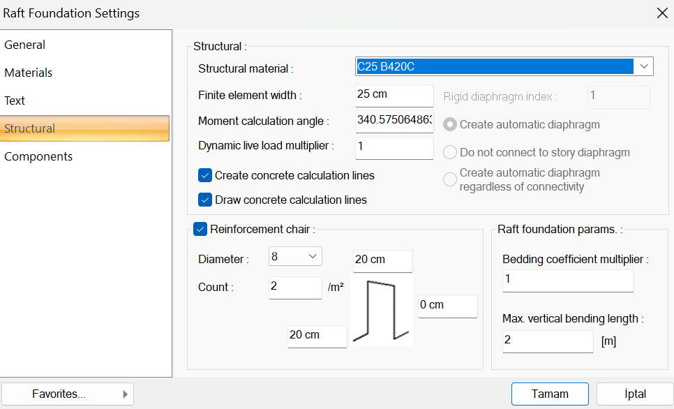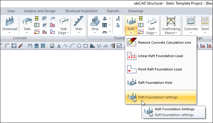 With the Raft Foundation Settings command, settings such as concrete raft foundation size, elevation, material selection, structural material can be accessed.