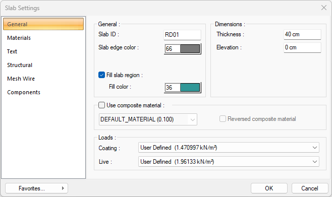Use composite material ![]() Composite materials allow the slab to be drawn in a different material view in cross-section. If checked, it allows the use of materials defined in the "Composite Material" editor. After the row is marked, one of the composite materials in the list below is selected with the left mouse button. Changes the appearance of the slab in section according to the selected composite material. |