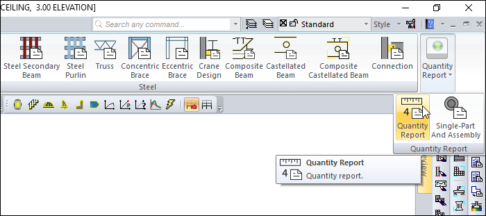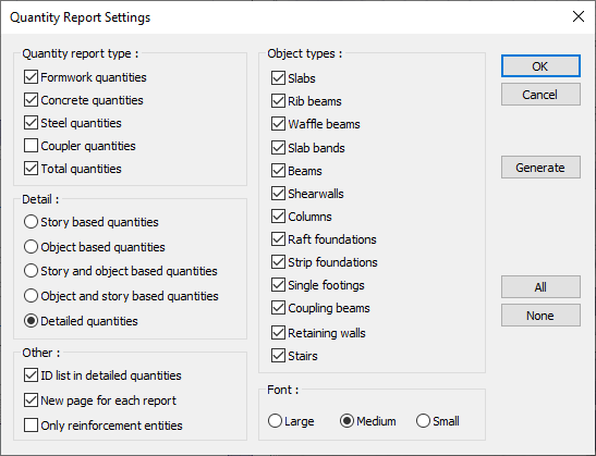 Required elements can be included in the quantity report by selecting them from the quantity report settings dialog.