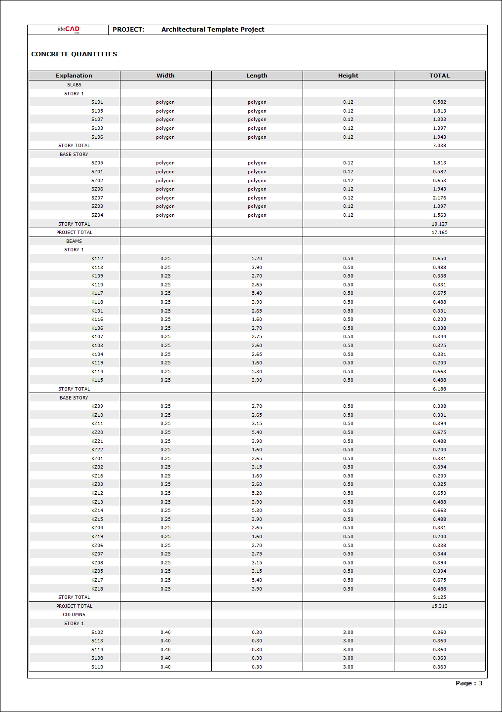 In ideCAD Structural, you can automatically create formwork, concrete, rebar, sleeve rebar attachment and total quantities. Quantities can be taken at any stage of the project. Quantities are automatically created according to the current project.