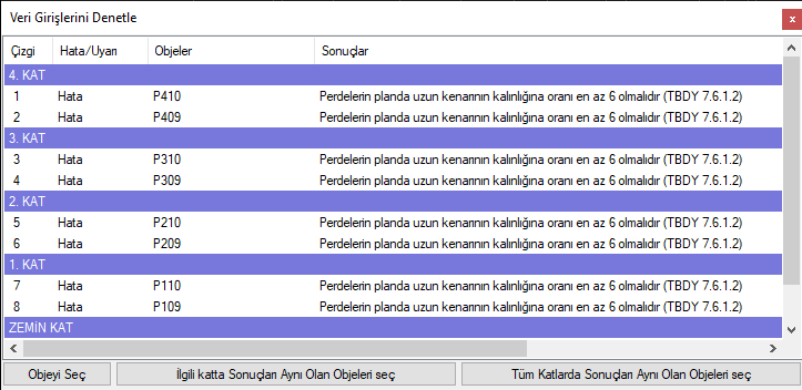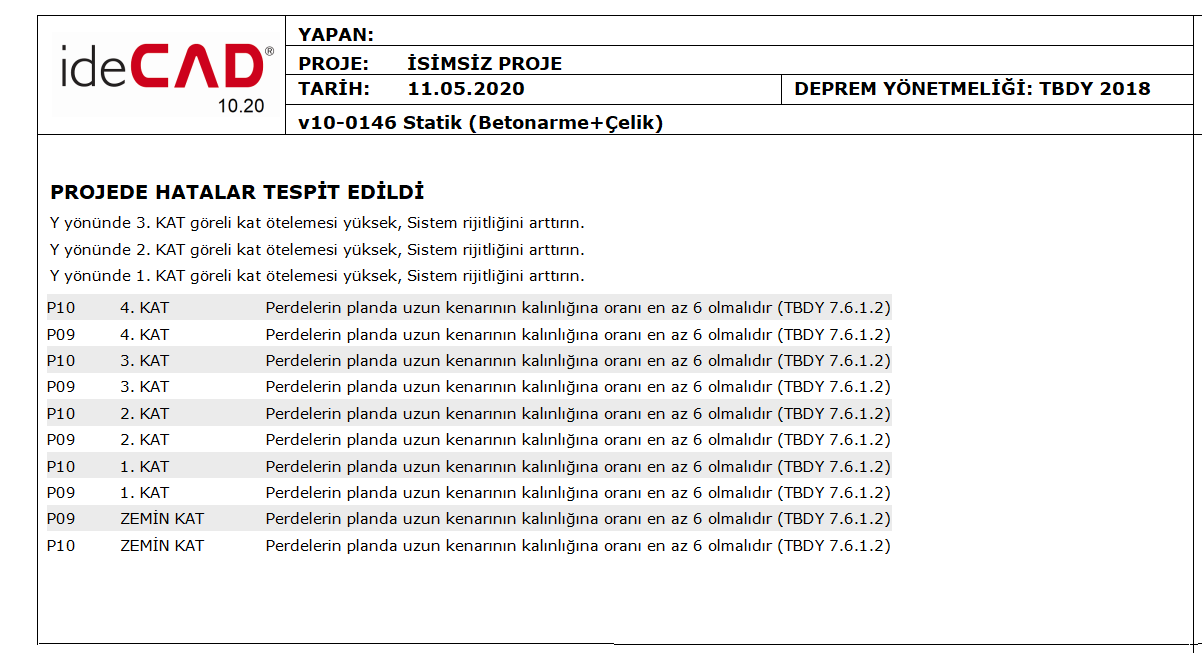 Rectangular reinforced concrete curtains are structural system elements defined as at least 6 (six) ratio of length to thickness in the section . In the geometry control and the optional report, the ratio of the length in the cross section to its thickness is automatically checked and a warning is given if there is any not suitable for control.