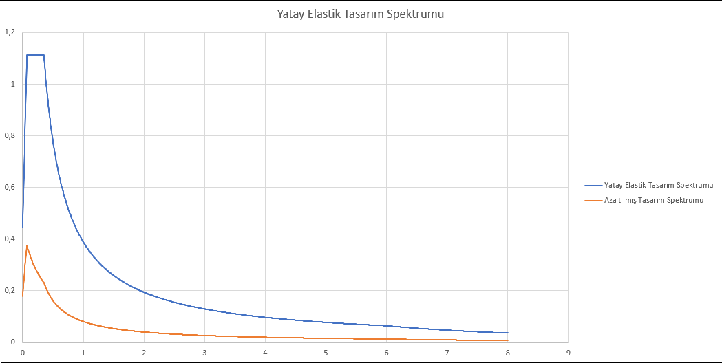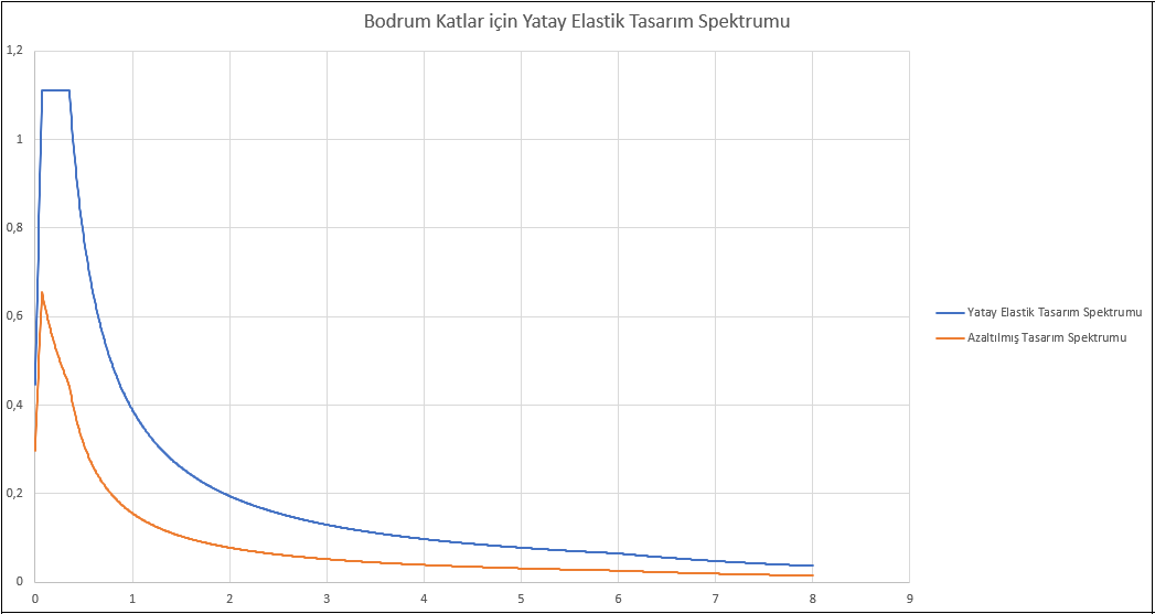 In accordance with TBDY 2018 4.8.5.3, the Building Importance Factor for the lower part of the building is taken by taking I = 1, R = 2.5 and D = 1.5 and the horizontal elastic design spectrum reduced in both directions for the earthquake level DD-2 is determined.