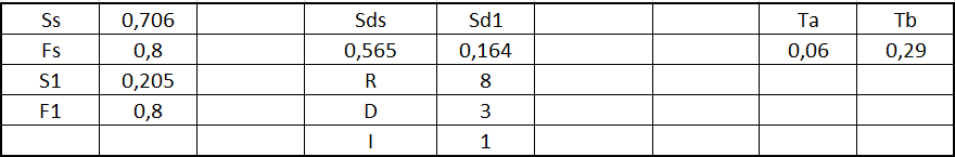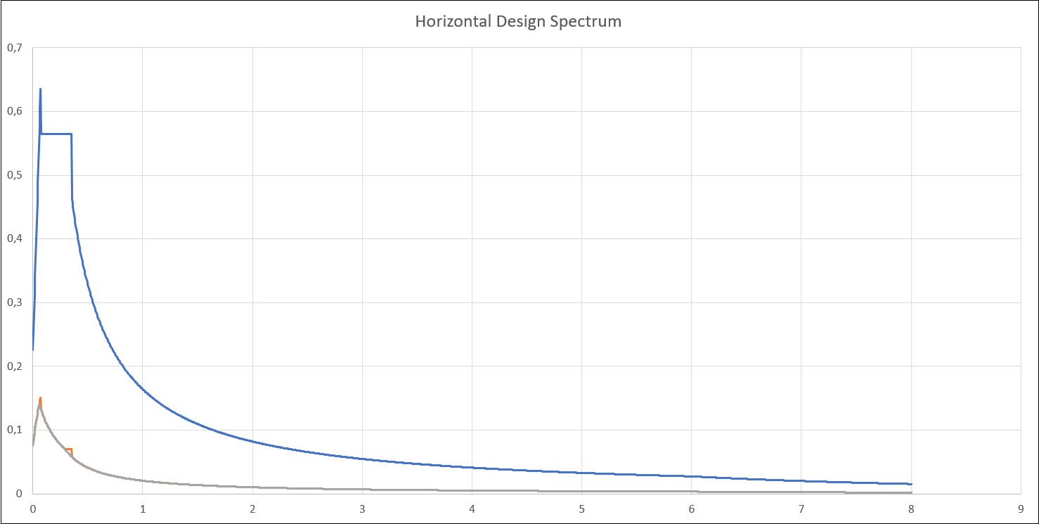 By using Building Importance Factor I=1 for the upper part of the building and R=4.8, D=2.5 in the X and Y directions, a reduced horizontal elastic design spectrum in both directions is obtained for DD-2.