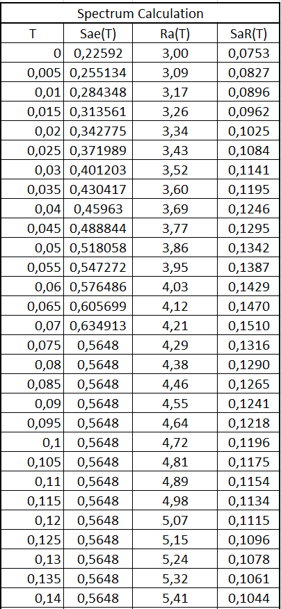 The following images show the calculation of Ra(T) and the reduced design spectrum with excel. The equations given above are used in this calculation.