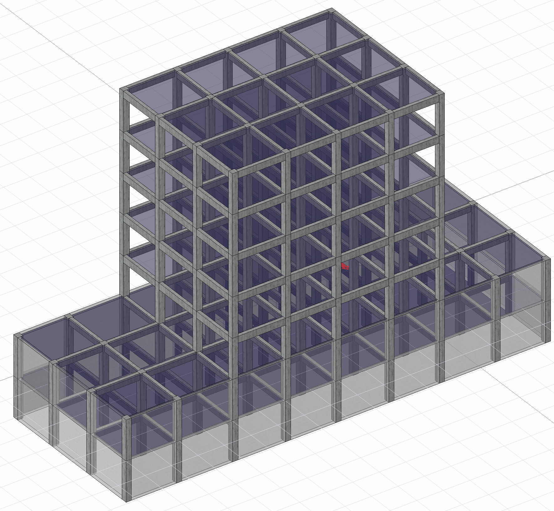 As shown in the picture below, in a building with 2 basement storşes and 5 normal stories, no shearwall is defined except for rigid basement walls. Rigid basement shearwalss are not taken into analysis when selecting the load-bearing system of such a building according to Table 4.1 . For this reason, the bearing system of the building shown below can be classified as buildings in which all earthquake effects are carried by reinforced concrete frames with high (or limited) ductility level .