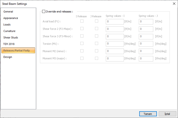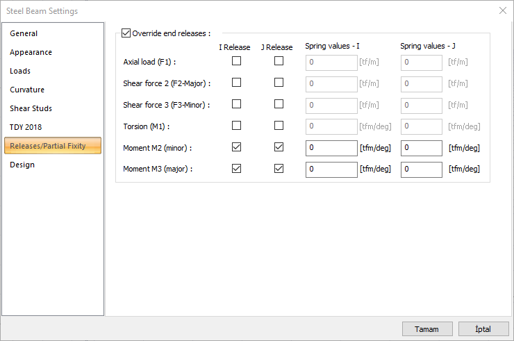 If it is intended to define an articulated connection for the i and j ends of any steel element, the M2 and M3 boxes at the relevant ends are checked in the Releases/Partial Fixity tab of the steel element properties and the arc values are entered as “0” zero.