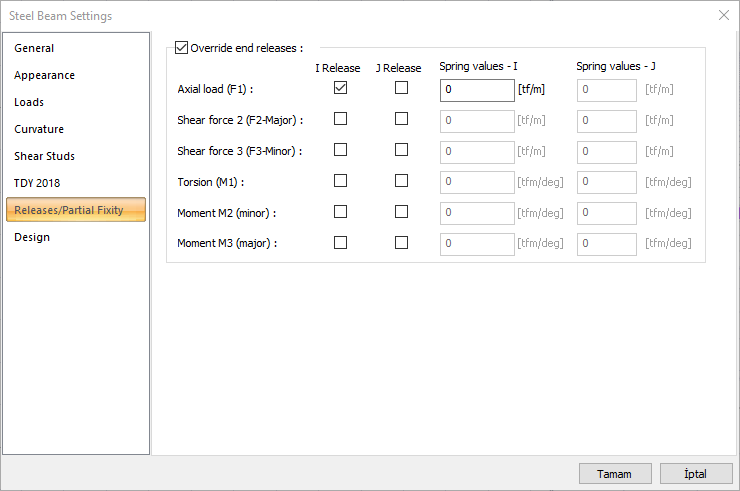 In order to create this situation in the analysis model, it is necessary to mark the F1 release at the relevant end from the releases tab of the steel element properties and enter the arc value as “0” zero.