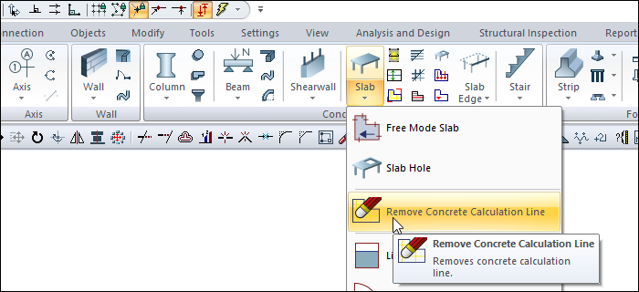 The calculation line on an existing concrete slab is deleted with the Remove Concrete Calculation Line command.