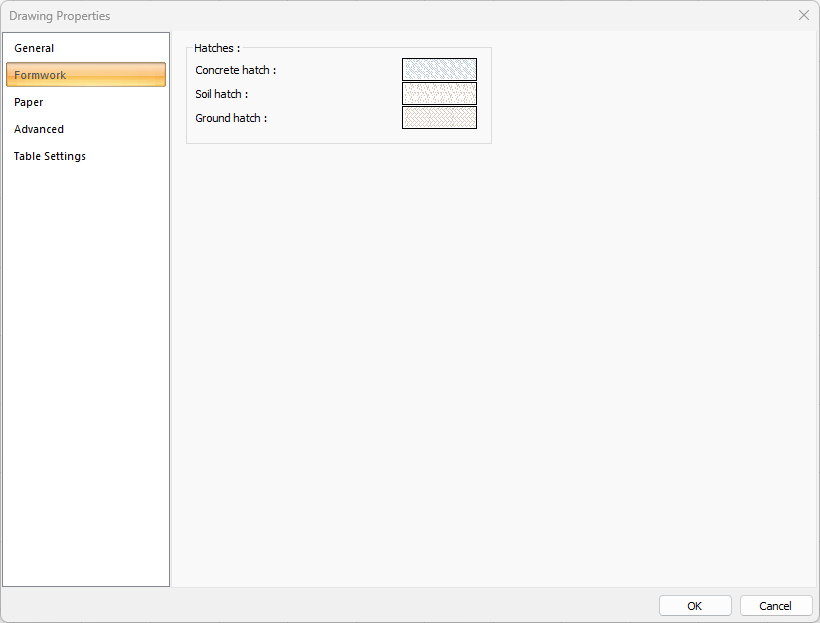 Soil hatch ![]() It is the hatch type that is valid for the soil. Clicking on hatch opens the Hatch Settings dialog. The hatch type is selected from the lookup table in this dialog. |