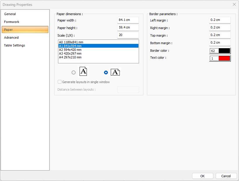 Standard paper sizes ![]() Standard paper sizes are listed. The layout size can be selected from the list, as well as the layout dimensions can be determined by entering the width and height values. |