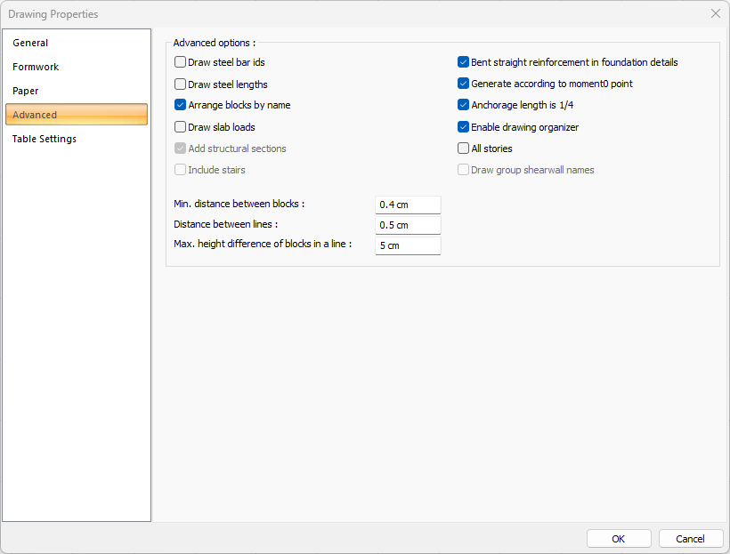 Distance between lines ![]() Minimum vertical distance between blocks is entered. The block is each opening itself, with its rebars, sections and dimensioning. |
