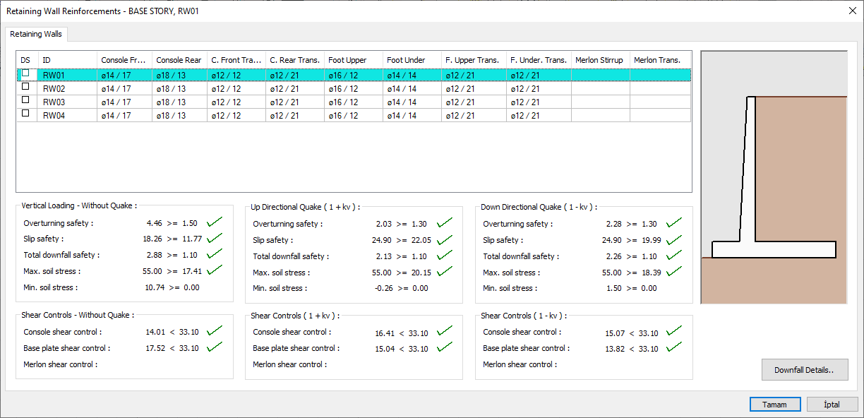 Retaining wall reinforcement design results and inadequacy of individual foundations are displayed in the Retaining Wall Reinforcements dialog. Reinforcement results, rollover and slip safety and total collapse details results are given in the retaining wall reinforcements dialog.