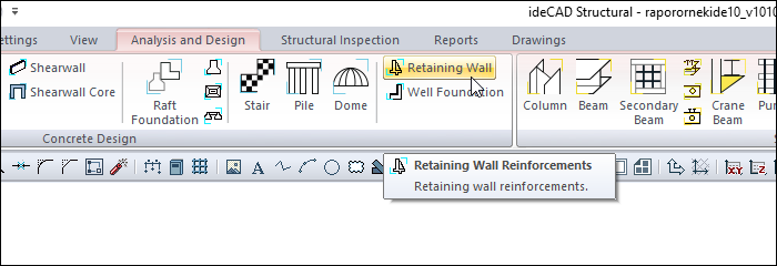 After the Retaining Wall Analysis is done, you can access it by clicking the Retaining Wall command under the Concrete Design heading in the ribbon menu Analysis and Design tab.
