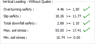 Vertical loading - without earthquake free ![]() Information on external stability controls obtained as a result of without earthquake loading is printed under this section. |