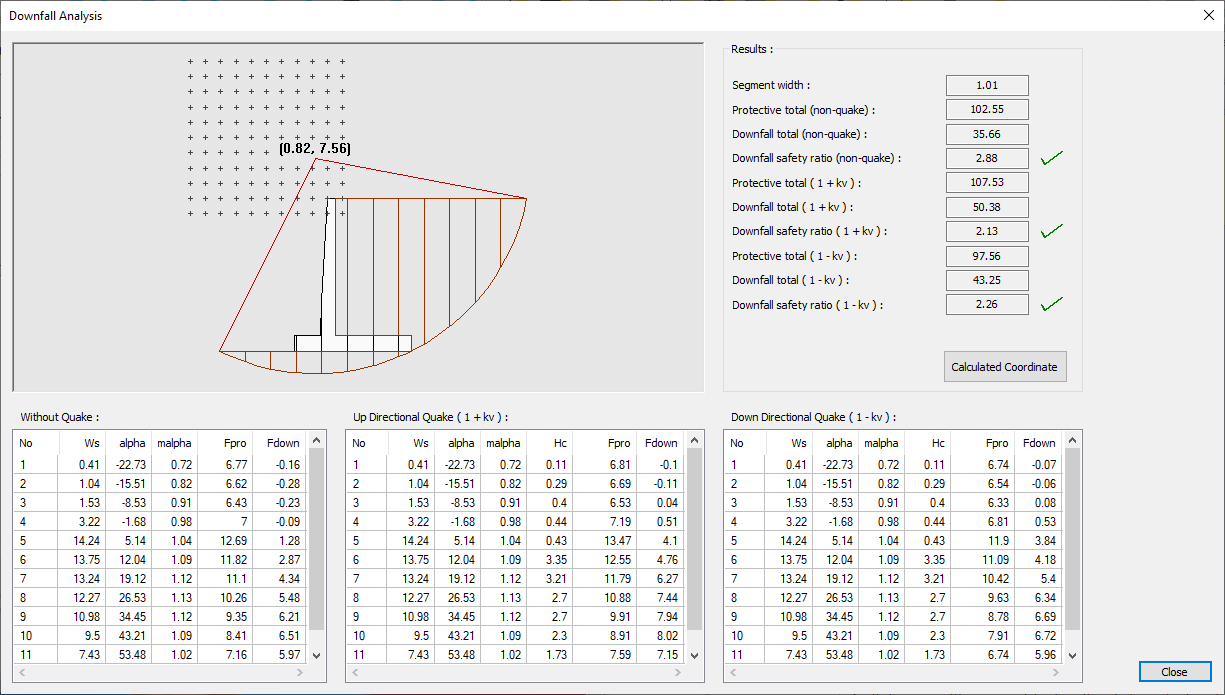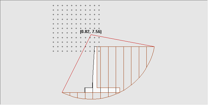 Schematic drawing and coordinate selection area ![]() Schematic drawing of the retaining wall. The program makes iterations using the slice method. By clicking on the figure on the screen, the account values for different downfall circle can be displayed. |