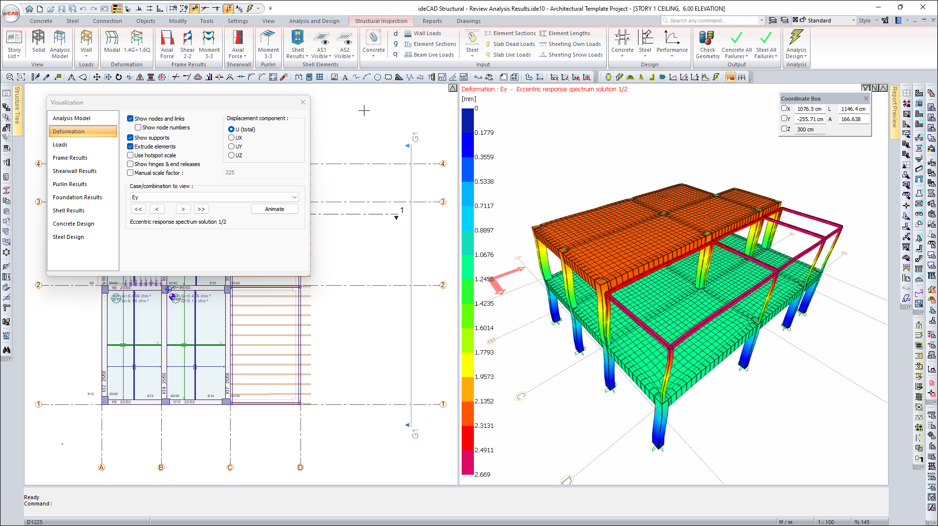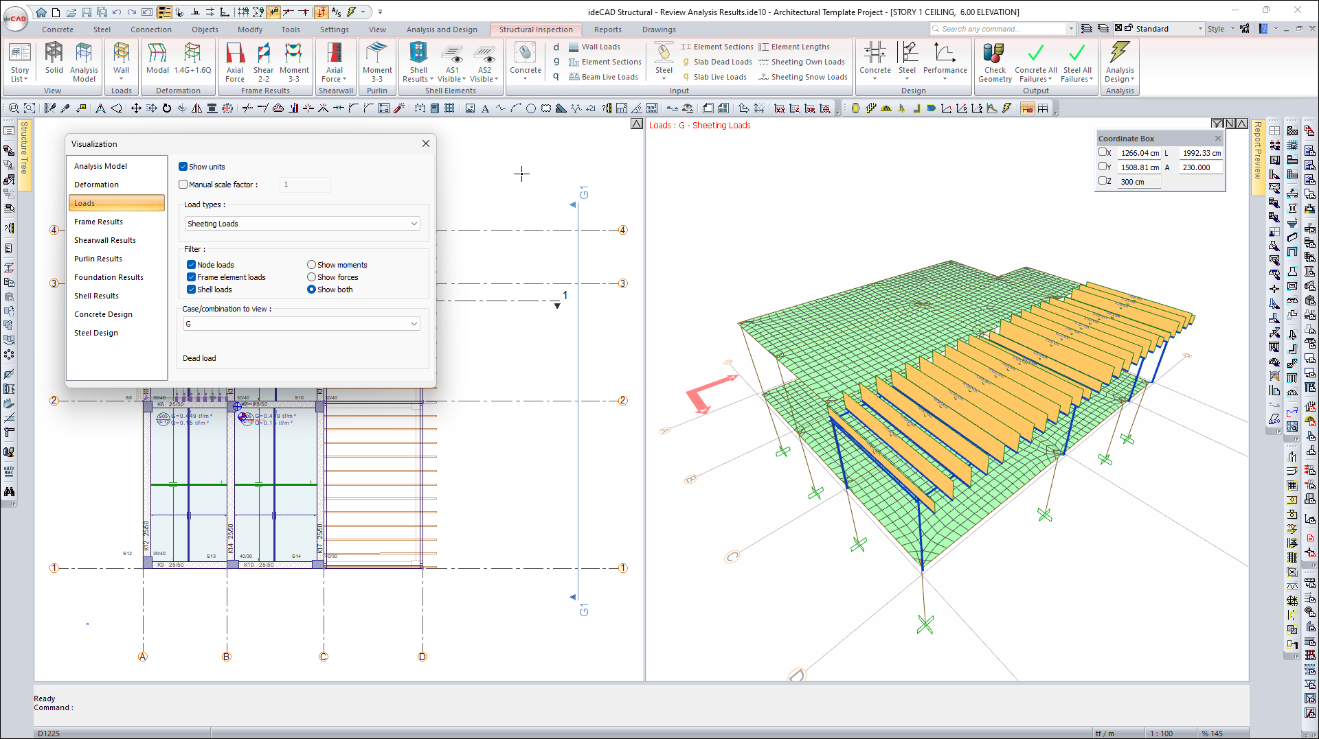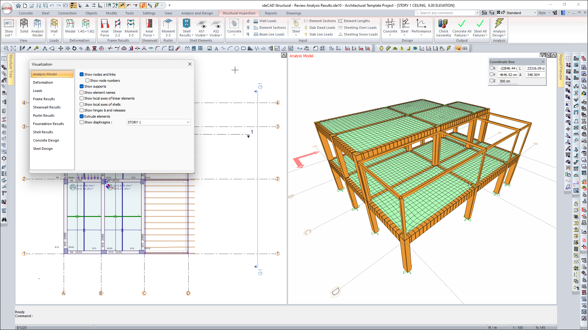 As a result of the changes made in the structural system and load model, the Analysis + Design results are reviewed again.