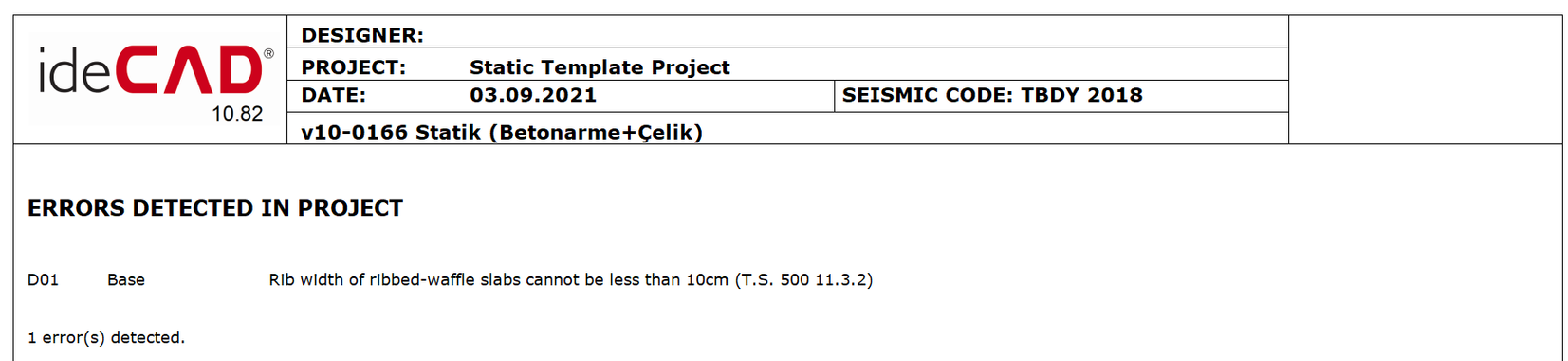 According to TS500 11.3.2 for ribbed and waffle slabs, the width of the rib should be at least 10 cm. A warning is given when the rib width on toothed floors is less than 10 cm.