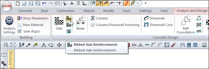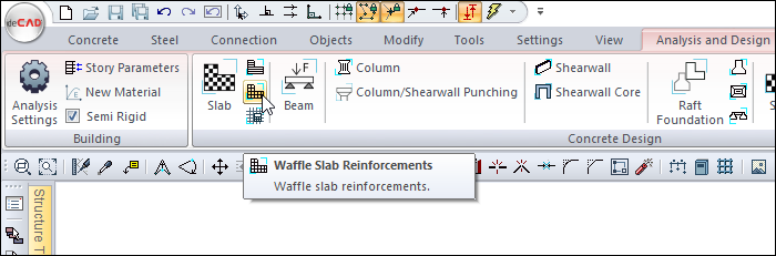After analysis, you can access it by clicking on the Ribbed/Waffle Reinforcements command under the Concrete Design title of the ribbon menu Analysis and Design tab .