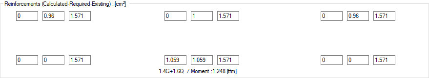 Reinforcements (calculated-required-existings) ![]() In the left support of the beam, upper and lower; in the middle; clearance and mounting; in the right bracket; The total of existing/required and surplus rebar areas are given as top and bottom. Just below, the loading combination of the rebar calculation and the moment values of that combination are also written. |