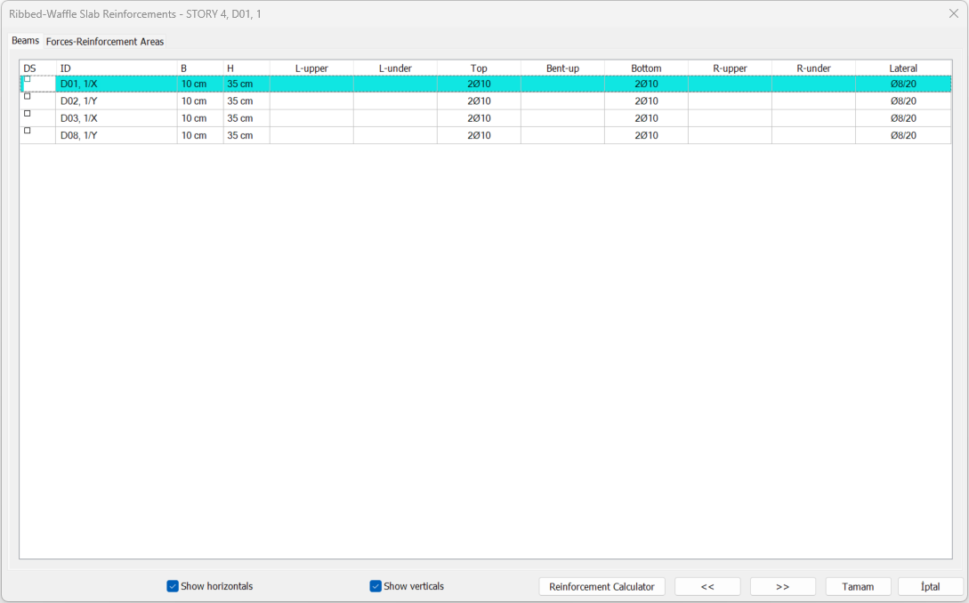 B, H ![]() Beam is the width and height of the tooth, respectively. You can change the dimensions by double clicking in the B and H cells. When the size is changed, the dental rebar calculation is made for that beam according to the changed dimensions. |