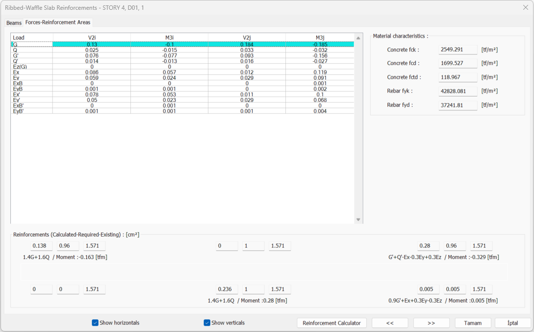Analysis, design and code requirements check results of ribbed or waffle slabs are displayed in the Ribbed-Waffle Reinforcements dialogue. Reinforcement and internal force (moment, shear force) information on rib and waffle beams are given in the Ribbed-Waffle Reinforcements dialog.