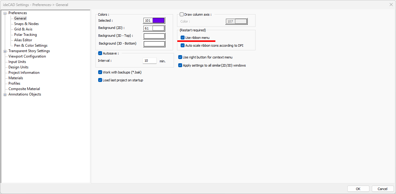 If you want to use the classic menu instead of the ribbon menu, you can uncheck the " Use ribbon menu" option from the Preferences dialog. When you close and open the ideCAD, the classic menu will be activated.