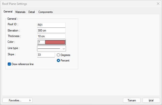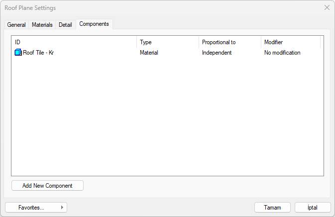 Thickness | It means that the length of the material will be found by multiplying the length measurement found when defining the material and the thickness of the roof. | |