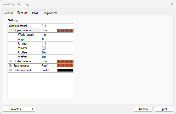 Perimeter | It means that the length of the material will be found by multiplying the circumference of the roof with the length measurement found when defining the material. | |