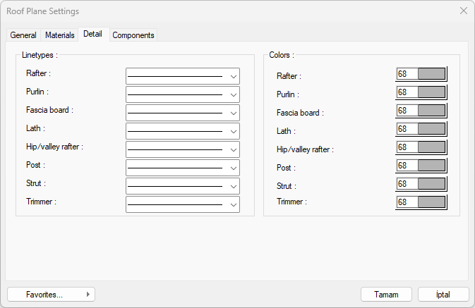 Detail material ![]() The material to be used on the surfaces of the roof details is selected from the list. The material list window opens with the left mouse button. The material is selected from the opened material list. The materials must be predefined. |