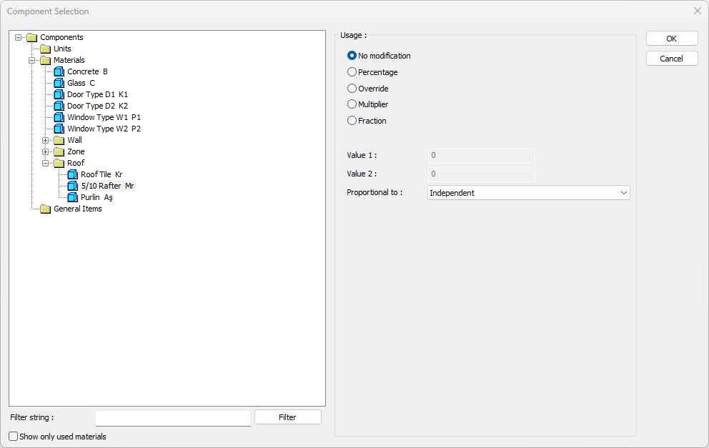 Percentage: This line is marked when it is desired to be used with the percentage of the amount previously determined in the material definition, as much as the value entered in the "Value 1" line in the same dialog. For example, if the material quantity is 70, if the line “Value 1” says 40, it means the material amount will be used up to 40 * 70%.