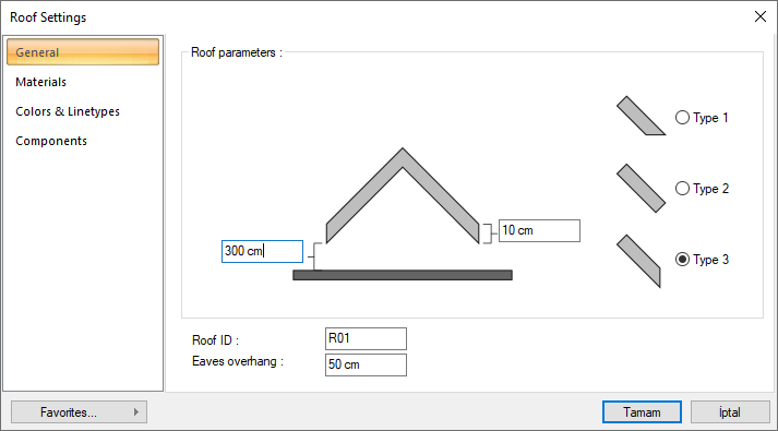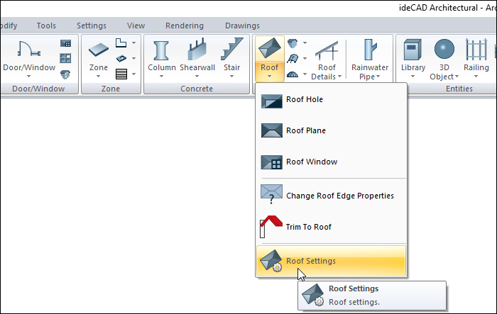 With the Roof Settings command, settings such as eave type, parameters, eave distance, drawing shape and material can be accessed.