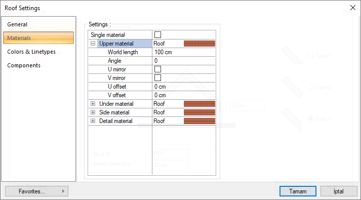 Perimeter | It means that the length of the material will be found by multiplying the circumference of the roof with the length measurement found when defining the material. | |