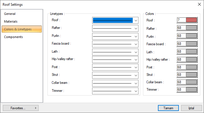 Colors ![]() Different colors can be used for each roof element. Click on the color box with the left mouse button and the mouse cursor slides over the opened color palette. The button is released when the wanted color is reached. The color box turns into the selected color. If the color box is clicked on the keyboard with the Shift key, the pen thickness of the relevant color can be adjusted. |