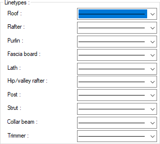 Linetypes ![]() Linetype is selected separately for roof, rafters, purlins, fascia board, lath, hip/valley rafter, post strut, collar beam and trimmer. Clicking the down arrow button on the right side of the boxes opens the list of line types. From here, the desired line type can be selected by clicking the left mouse button. There are 22 types of line types available. |