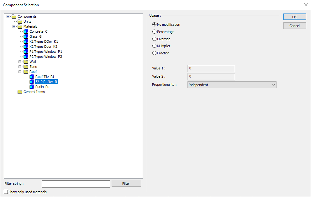 Click the OK button. The "Component Selection" dialog will be closed. A summary line of the material will appear in the Components tab. More than one material assignment can be made to an object.
