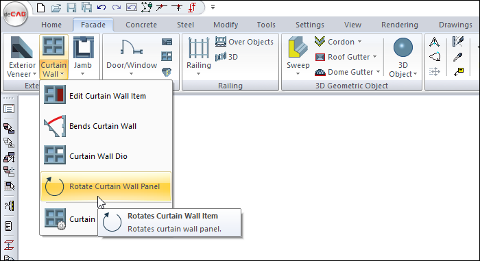 The Rotate Curtain Wall Panel command allows the curtain walls to be defined at a different angle from the curtain wall panel. With this command, windows are opened at a certain angle on the curtain wall.