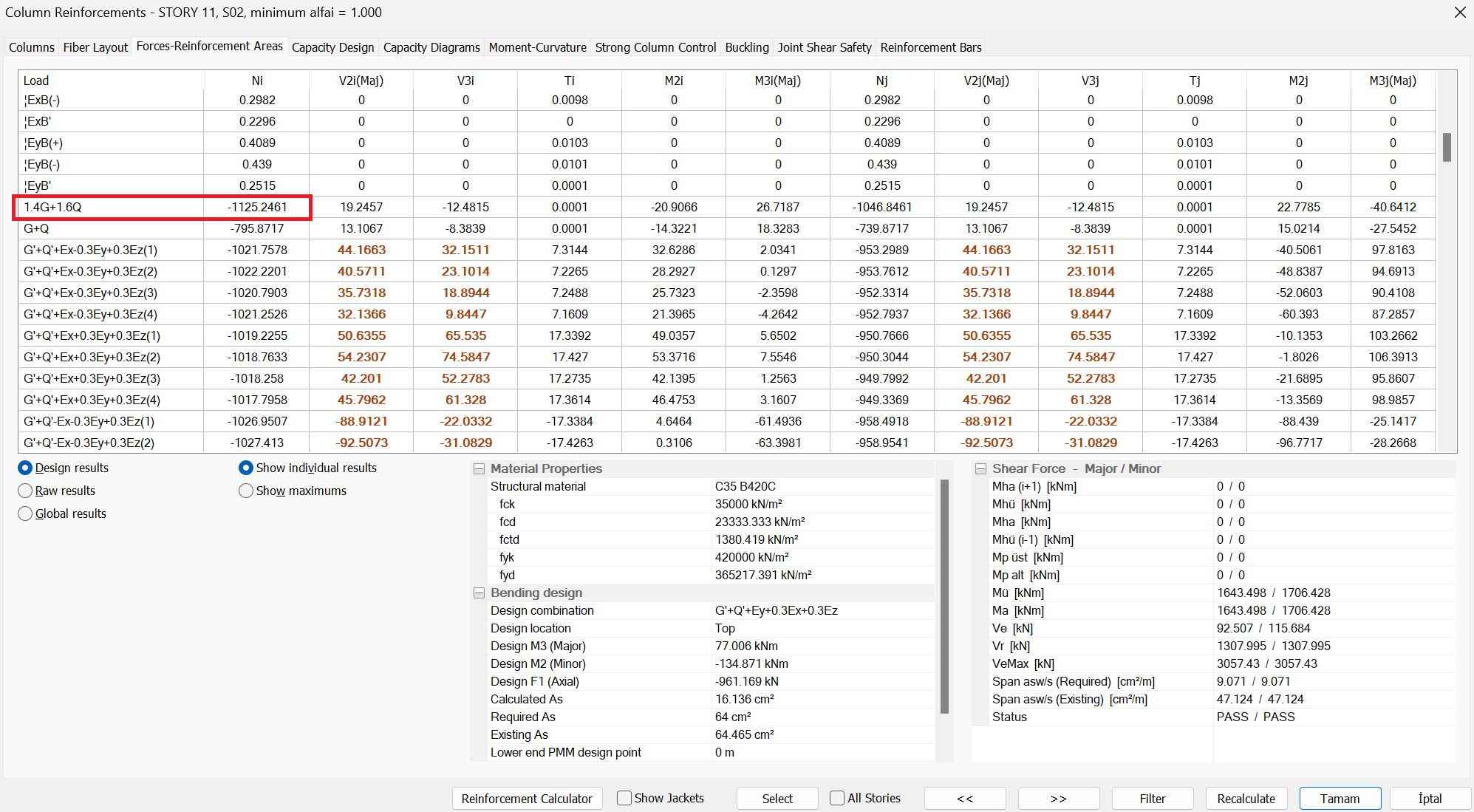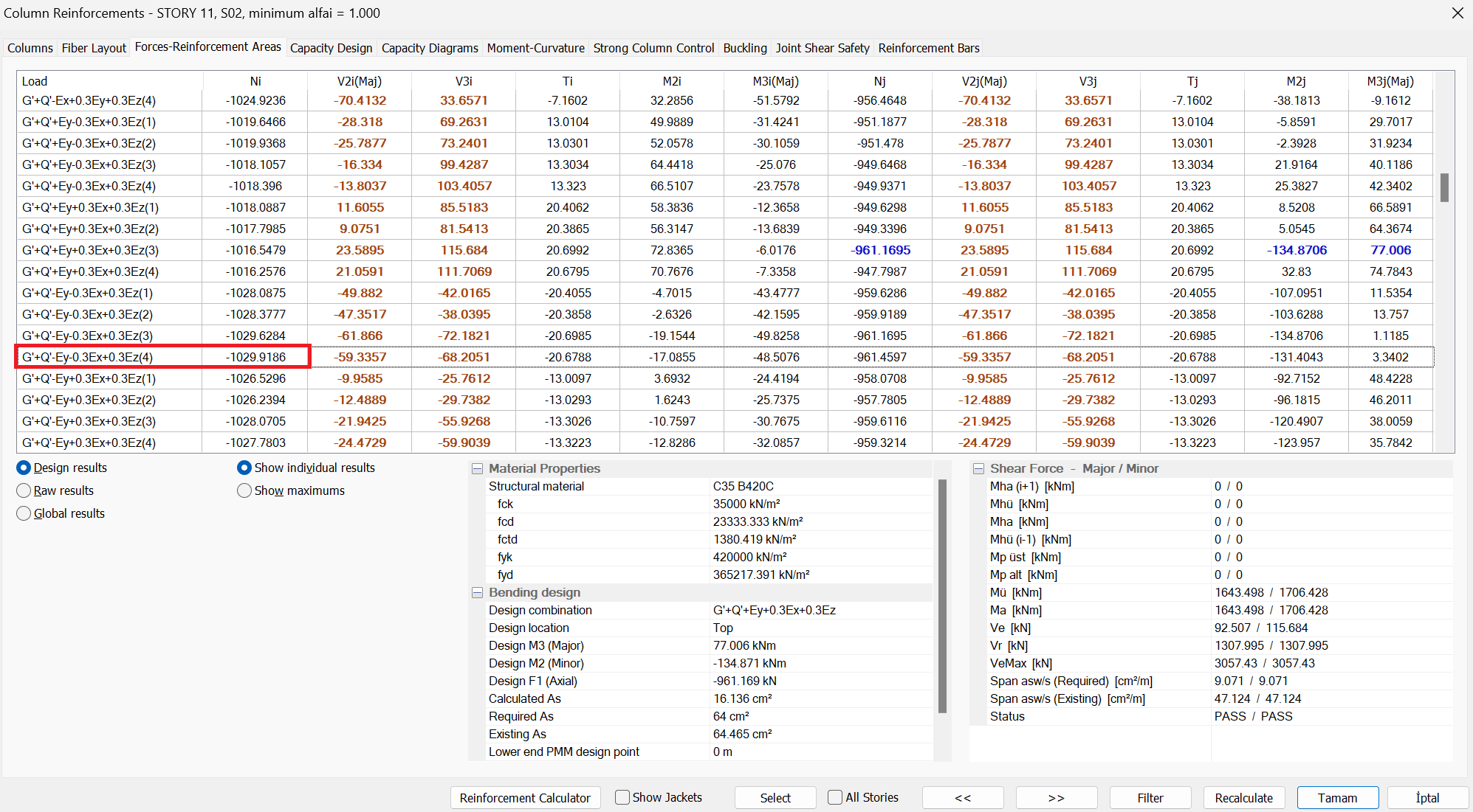 In the program, in the reinforced concrete design - columns tab, all loading combinations for the 11th floor S02 column under the heading Forces-Reinforcement areas are examined, and it is determined that the greatest axial compression force occurred for the G+Q +E case and 1.4G+1.6Q for all loading combinations.