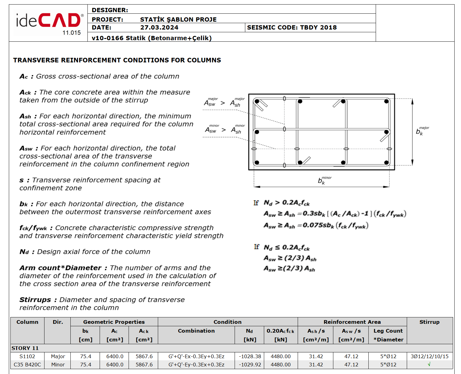 In the column report obtained from the program below, the control included in TS 500 7.4.1 is summarized, as well as the TBDY 7.3.1.2 control.