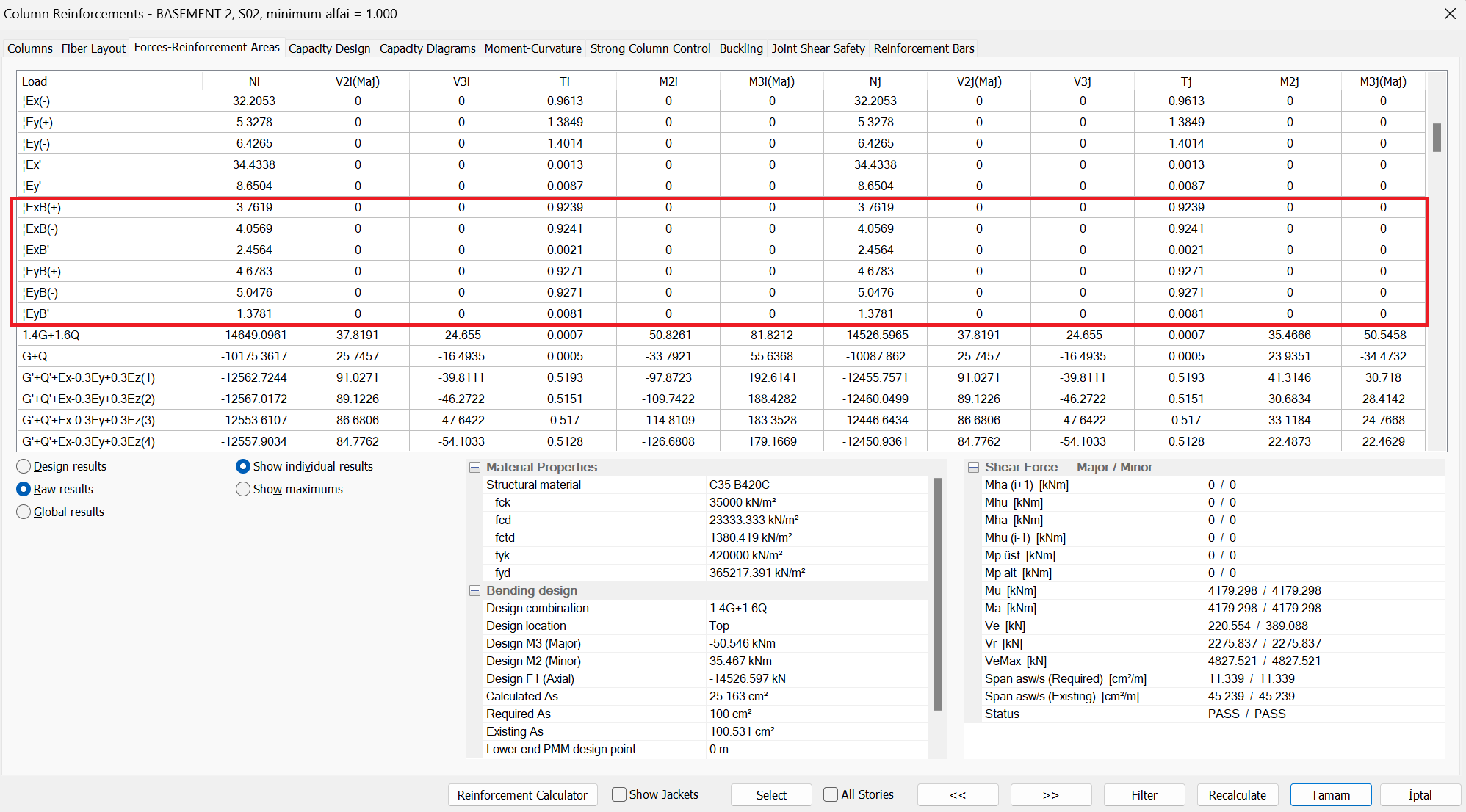 The second stage, the monolithic solution internal force results, are as follows. For example, the S02 column of the 2nd basement floor is used. In this column, which is a lower section element, the results of the first and second-stage cases will be used to determine the internal forces based on the design.