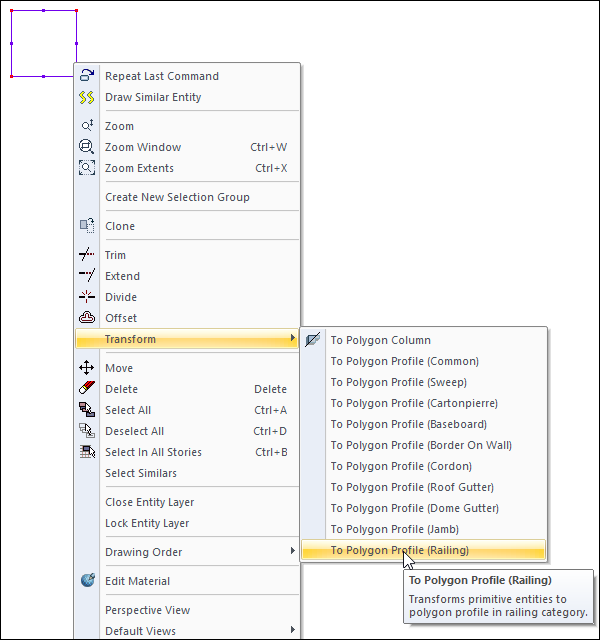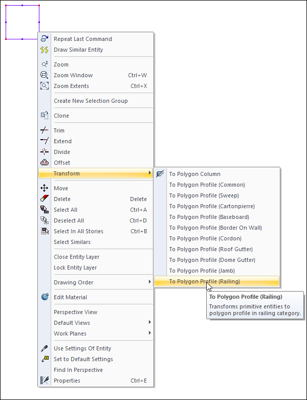 Clicking the Transform/To Polygon Profile (Railing) line by selecting the box and clicking the right mouse button ![]() |